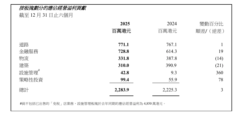 设施管理管理及营运香港地标性设施期内,设施管理业务板块的应占经营溢利录得4,280万港元,按年增长360%。若不包括于2024年12月出售的「免税」店业务,板块应占经营溢利则按年下降12%。